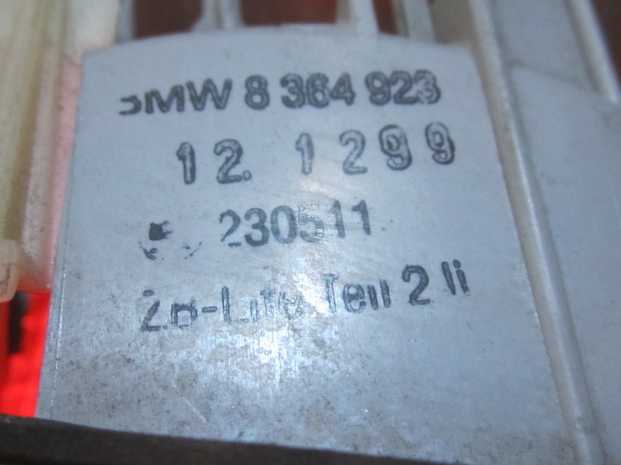Please compare the part number(s): 8364923, 8 364 923, 8 364 923 4 DOOR This part is compatible with 8 vehicle(s). Notes Important part details Year Make Model Trim Engine Part Type: Tail Light, Position: Rear Left Inner, Mfr Body...more 2001 BMW 325i Base Sedan 4-Door 2.5L 2494CC 152Cu. In. l6 GAS DOHC Naturally Aspirated Part Type: Tail Light, Position: Rear Left Inner, Mfr Body...more 2001 BMW 325xi Base Sedan 4-Door 2.5L 2494CC 152Cu. In. l6 GAS DOHC Naturally Aspirated Part Type: Tail Light, Position: Rear Left Inner, Mfr Body...more 2001 BMW 330i Base Sedan 4-Door 3.0L 2979CC l6 GAS DOHC Naturally Aspirated Part Type: Tail Light, Position: Rear Left Inner, Mfr Body...more 2001 BMW 330xi Base Sedan 4-Door 3.0L 2979CC l6 GAS DOHC Naturally Aspirated Part Type: Tail Light, Position: Rear Left Inner, Mfr Body...more 2000 BMW 323i Base Sedan 4-Door 2.5L 2494CC 152Cu. In. l6 GAS DOHC Naturally Aspirated Part Type: Tail Light, Position: Rear Left Inner, Mfr Body...more 2000 BMW 328i Base Sedan 4-Door 2.8L 2793CC l6 GAS DOHC Naturally Aspirated Part Type: Tail Light, Position: Rear Left Inner, Mfr Body...more 1999 BMW 323i Base Sedan 4-Door 2.5L 2494CC 152Cu. In. l6 GAS DOHC Naturally Aspirated Part Type: Tail Light, Position: Rear Left Inner, Mfr Body...more 1999 BMW 328i Base Sedan 4-Door 2.8L 2793CC l6 GAS DOHC Naturally Aspirated make sure to check with your local dealer before purchasing it.